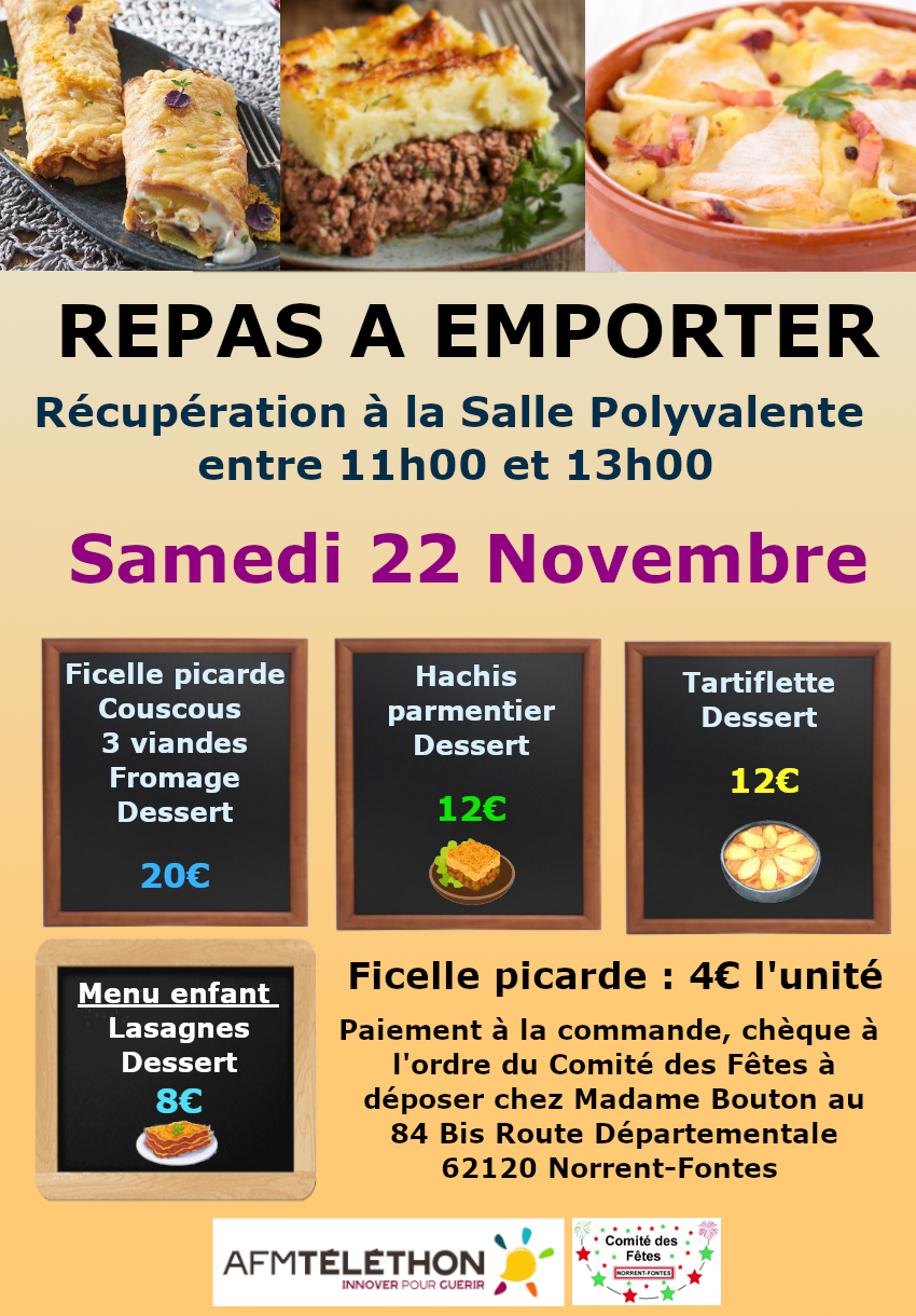Récupération à la Salle Polyvalente entre 11h00 et 13h00 le Samedi 22 Novembre.
