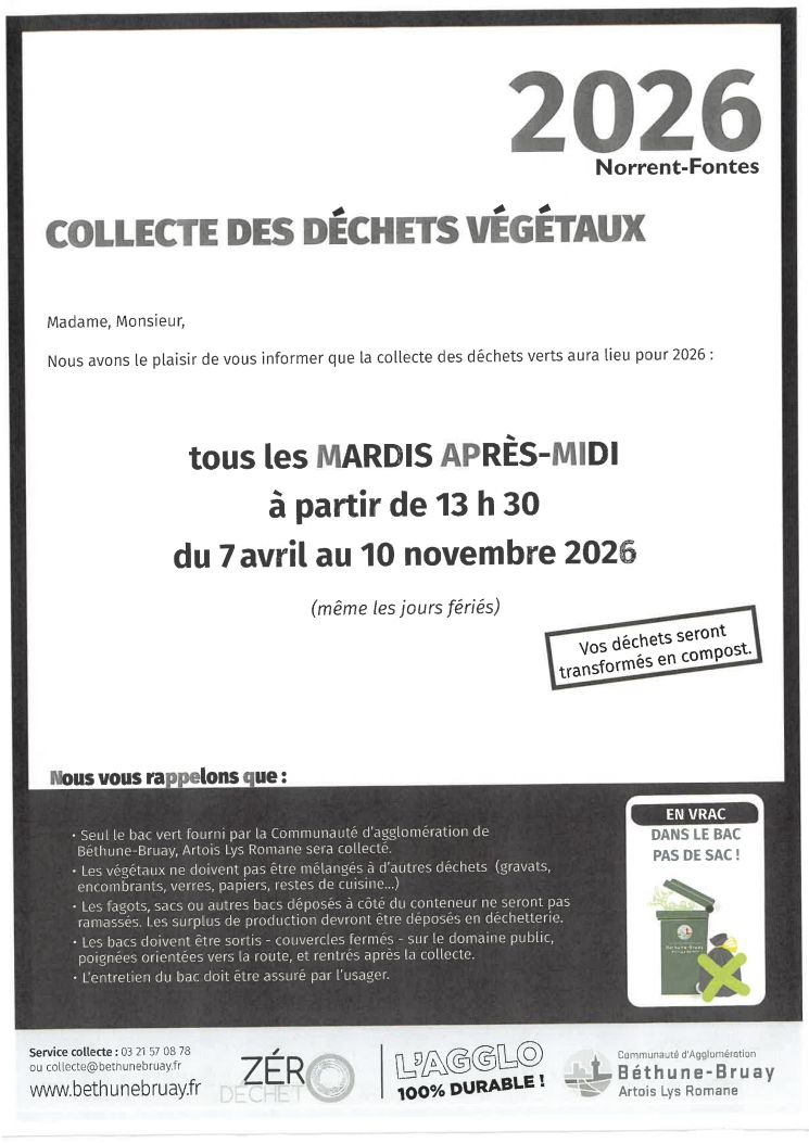 La collecte des déchets verts aura lieu du 7 Avril au Mardi 10 Novembre tous les Mardis après-midi à partir de 13h30.