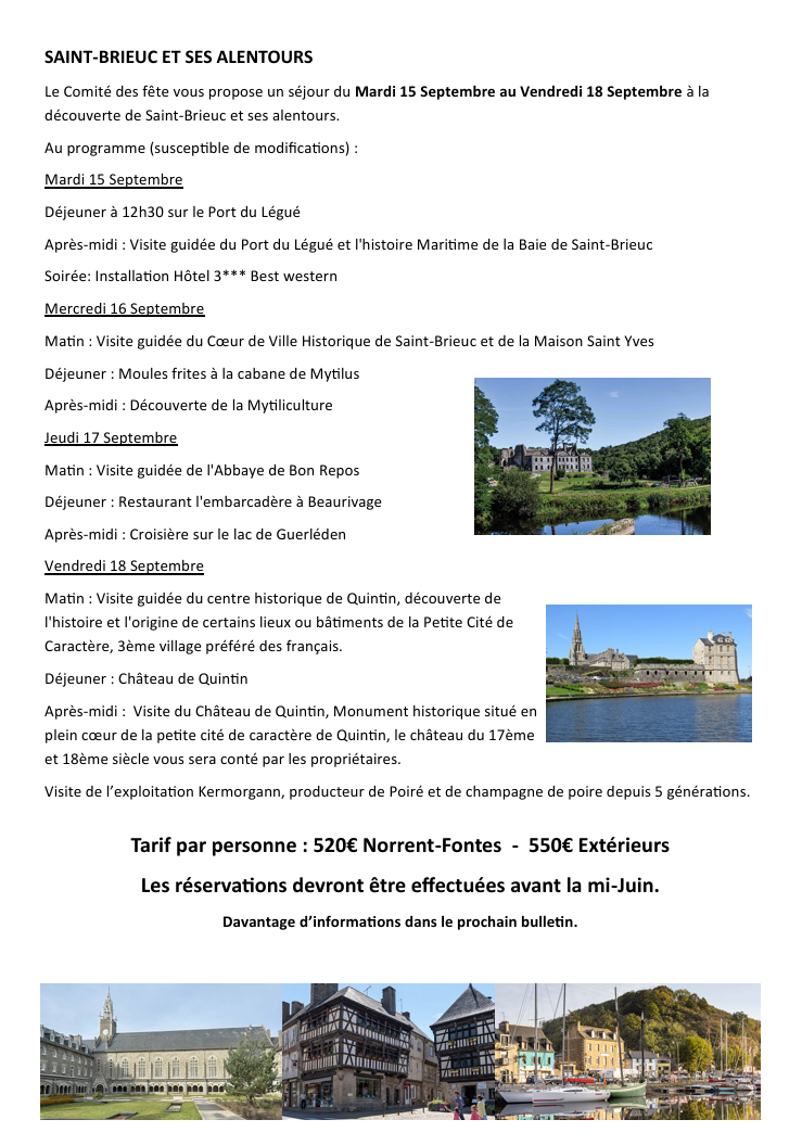 Le Comité des fête vous propose un séjour du Mardi 15 Septembre au Vendredi 18 Septembre à la découverte de Saint-Brieuc et ses alentours.
